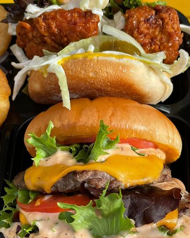 Galette de bœuf double avec fromage cheddar, sauce tasty, laitue, tomates et cornichons.