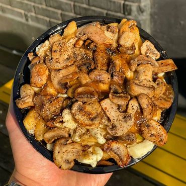 Poutine avec champignons caramélisés.