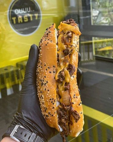 Steak de bœuf, oignons, poivrons verts et champignons caramelisés, fromage mozzarella fondue et sauce mayo.