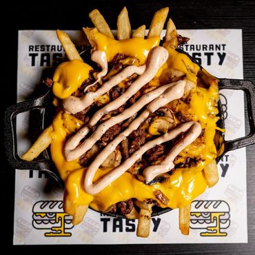 Frites avec steak de bœuf,oignons et champignons caramélisés, sauce fromage et sauce cocktail (Tasty).